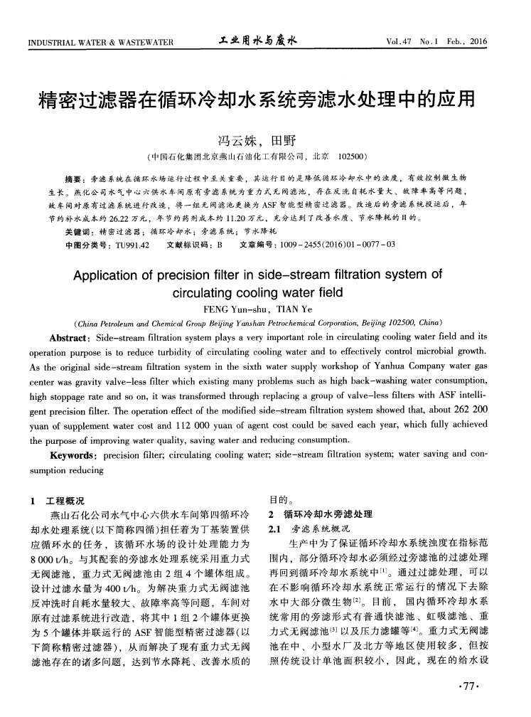 冷卻水旁路過(guò)濾目前多采用砂濾和多介質(zhì)過(guò)濾器。系統(tǒng)本身需要反洗用水量巨大是一個(gè)難以解決的問(wèn)題。同時(shí),設(shè)備中的過(guò)濾介質(zhì)需要定期更換,操作繁瑣,廢棄的過(guò)濾介質(zhì)難以處理也是砂濾和多介質(zhì)過(guò)濾器的缺陷。